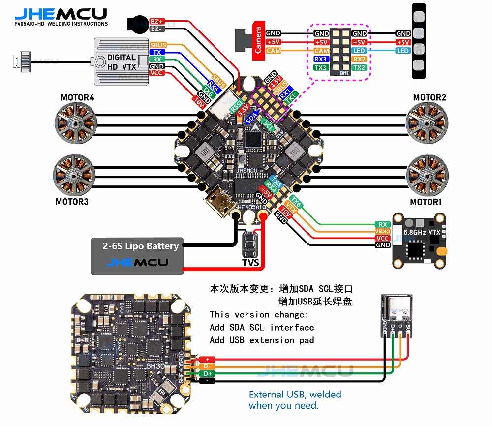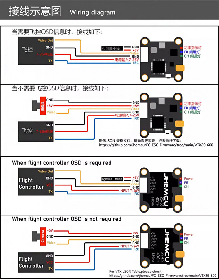 - 红线 (VCC) → 飞控 BEC输出正极(电压必须在图传额定范围内)